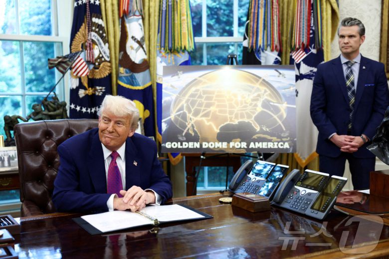 도널드 트럼프 미국 대통령이 20일(현지시간) 미국 워싱턴DC 백악관 집무실에서 피트 헤그세스 미국 국방부 장관이 배석한 가운데 '골든돔'(Golden dome) 미사일 방어시스템에 대해 발표하고 있다. 2025.05.20 ⓒ 로이터=뉴스1 ⓒ News1 류정민 특파원 |