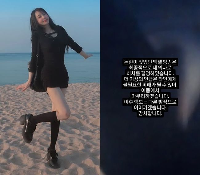 21일 서유리는 소셜 미디어 스토리에 “논란이 있었던 엑셀 방송은 최종적으로 제 의사로 하차를 결정하였습니다. 더 이상의 언급은 타인에게 불필요한 피해가 될 수 있어 이쯤에서 마무리하겠습니다. 이후 행보는 다른 방식으로 이어가겠습니다. 감사합니다”라는 글을 공개했다.