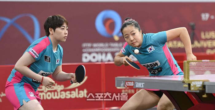 신유빈(오른쪽), 유한나가 20일(현지시간) 카타르 도하 카타르대학교 스포츠 컴플렉스에서 열린 2025 국제탁구연맹(ITTF) 세계선수권대회 여자복식 16강 독일 아네트 카우프만-샤오나 산 조와 경기를 펼치고 있다. 2025. 5. 20. 도하(카타르) | 최승섭기자 thunder@sportsseoul.com |