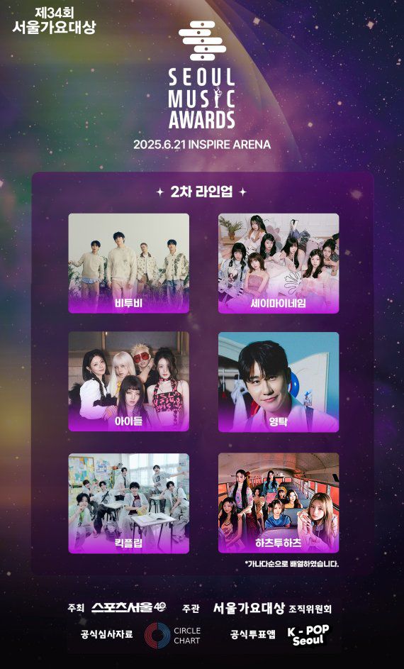 '제34회 서울가요대상'(스포츠서울 주최·서울가요대상 조직위원회 주관)은 21일 영탁, 비투비(BTOB), 아이들(i-dle), 세이마이네임(SAY MY NAME), 킥플립(KickFlip), 하츠투하츠(Hearts2Hearts) (데뷔 순) 등 2차 라인업을 발표했다.