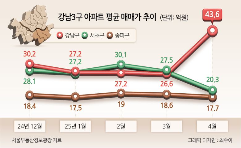 강남구 아파트 평균 매매가는 지난해 12월 30억2194만원으로 처음 30억대를 기록한 이후 올해 1~3월 27억1791만원→27억2330만원→26억6458만원 등의 추이를 보였다. 그러다 지난달 17억원 가까이 오르며 40억대로 훌쩍 뛰었다. 1년 전(2024년 4월, 24억1731만원) 대비해선 약 19억4000만원 높은 금액이다.