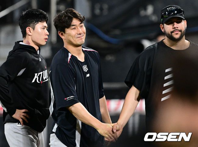 [OSEN=수원, 조은정 기자]KT가 대체 선발 조이현의 깜짝 호투를 앞세워 KIA 5연승 도전을 저지했다.프로야구 KT 위즈는 20일 수원KT위즈파크에서 열린 2025 신한 SOL뱅크 KBO리그 KIA 타이거즈와의 시즌 4차전에서 5-3으로 승리했다.경기를 마친 뒤 승리를 거둔 조이현이 문상철에게 기념구를 받고 있다. 2025.05.20