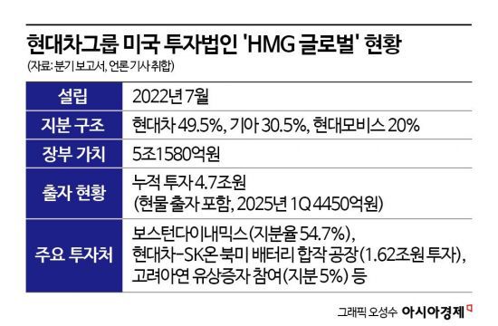 HMG글로벌은 현대차그룹이 미국 내 신사업 투자·관리를 위해 2022년 7월 설립됐다. 현대차와 기아가 각각 49.5%, 30.5%, 현대모비스가 20% 지분을 보유 중이다. HMG글로벌은 보스턴다이내믹스 지분의 현물 출자를 비롯해 현대차·SK온 미국 합작법인 설립, 고려아연 지분 인수 등 그룹사의 굵직한 전략 투자를 주도해왔다.