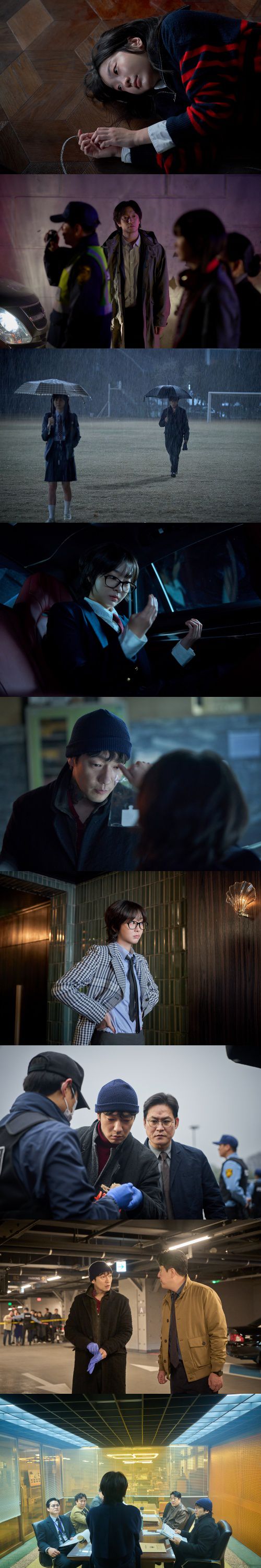 공개된 스틸은 10년 만에 다시 시작된 연쇄살인을 둘러싼 흥미진진한 전개를 담고 있어 작품을 향한 기대를 고조시킨다. 10년 전, 삼촌 윤동훈(지진희) 총경의 살인 사건 현장을 최초로 발견한 고등학생 이나는 충격으로 순간의 기억을 잃고, 사건 담당 형사 한샘은 그를 유력한 용의자로 의심한다. 현장보존선 위에 누운 이나의 모습은 독특한 분위기를 자아내는 가운데, 진술을 위해 경찰서로 향하는 이나를 날카로운 눈빛으로 바라보는 한샘의 모습은 10년 뒤에도 의심과 공조를 넘나드는 묘한 관계를 이어가는 두 사람의 첫 만남을 보여주며 흥미를 높인다.