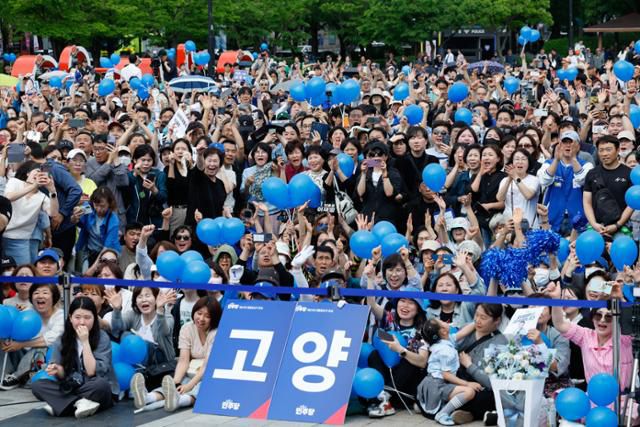 경마식 여론조사의 한계가 뚜렷합니다. 한국일보는 지지율 숫자를 뽑아내는 데 그치지 않고, 대선의 의미, 후보 역량과 자질, 공약 평가 등을 심도 있게 살피고자 일간지 최초로 유권자 3,000명 규모의 대선 인식 '웹조사'를 실시했습니다. 총5회 심층조사로 국민의 위대한 선택을 안내하겠습니다.이재명 더불어민주당 대선 후보가 20일 경기 고양시 일산동구 일산문화광장 앞에서 열린 집중유세에 나선 가운데 이 후보 지지자들이 연설을 지켜보고 환호하고 있다. 뉴시스 |