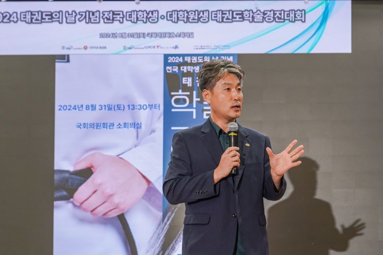 김중헌 태권도진흥재단 이사장이 지난해 8월31일 국회의원회관 소회의실서 열린 태권도의 날 기념 전국 대학생 대학원생 태권도 학술경진대회에서 모두발언을 하고 있다. 사진=태권도진흥재단 제공