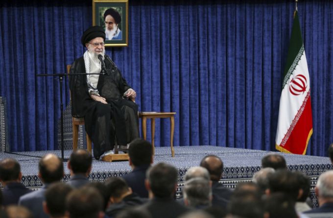 아야톨라 알리 하메네이 이란 최고지도자가 20일 이란 테헤란에서 지난해 헬기 추락사고로 숨진 고 에브라힘 라이시 대통령을 추모하는 자리에서 연설하고 있다. 그는 "이란은 우라늄 농축을 누구에게도 허가를 구하지 않을 것"이라며 이란의 우라늄 농축을 허용하지 않을 것이라는 미국의 발언에 대해 "말도 안 되는 것"이라고 일축했다./AP=뉴시스 |