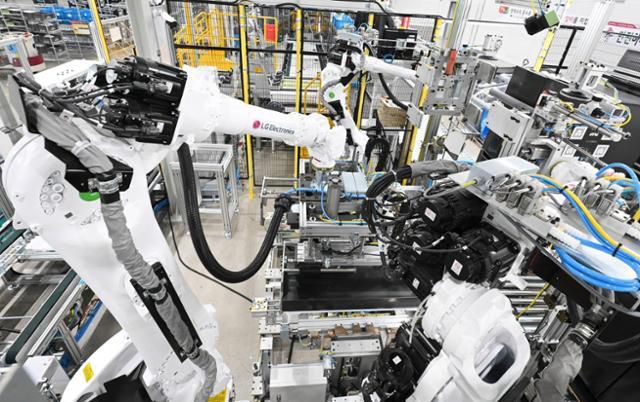 경남 창원시 LG전자 스마트파크에서 로봇 팔이 냉장고 문을 조립하고 있다. LG전자 제공 |