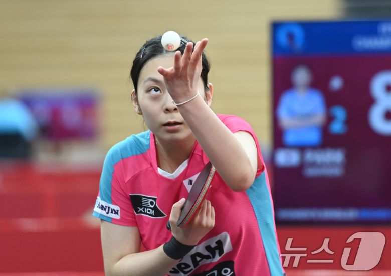 박가현이 20일(현지시간) 카타르 도하 카타르대학교 스포츠 컴플렉스에서 열린 '2025 국제탁구연맹(ITTF) 세계선수권대회' 여자단식 64강전에서 인도 마니카 바트라와 경기를 펼치고 있다. 2025.5.20/뉴스1 ⓒ News1 사진공동취재단 |