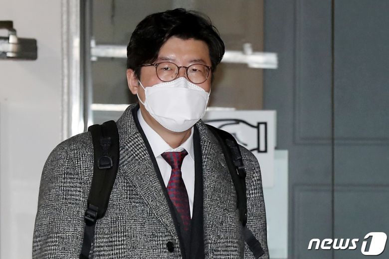 김학의 전 법무부 차관 불법 출국금지에 관여한 혐의로 기소된 이규원 대전지검 부부장검사가 21일 오전 서울 서초구 서울중앙지법에서 열린 속행공판을 마친 뒤 법원을 나서고 있다. 2022.1.21/뉴스1 ⓒ News1 민경석 기자