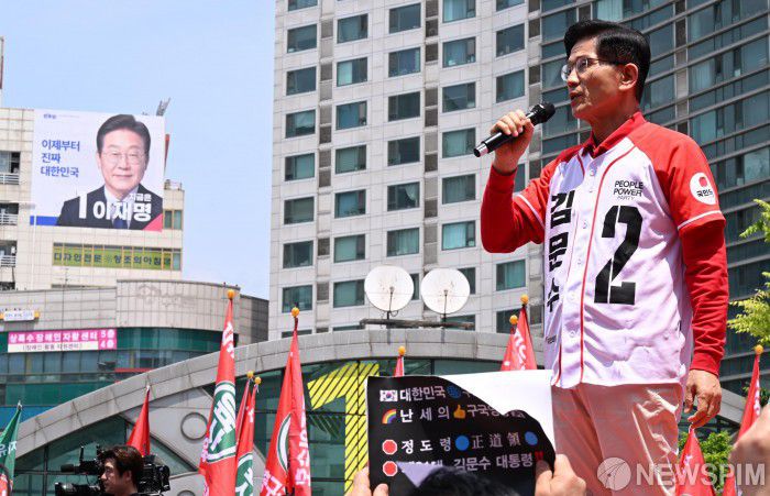 [고양=뉴스핌] 최지환 기자 = 김문수 국민의힘 대선후보가 21일 오전 경기 고양시 화정역 문화광장 앞에서 열린 유세 현장에서 지지를 호소하고 있다. 2025.05.21 choipix16@newspim.com |