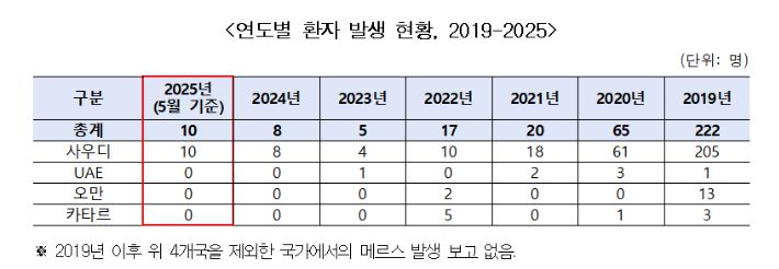 이들 4개국의 환자 수는 2019년 222명에서 2023년 5명으로 크게 줄었지만 지난해에는 8명으로 늘었으며, 올해는 지난 13일 기준으로 10명의 확진자가 나왔다. 10명은 모두 사우디에서 발생했으며, 이 중 2명(3월 1명·4월 1명)이 사망했다.