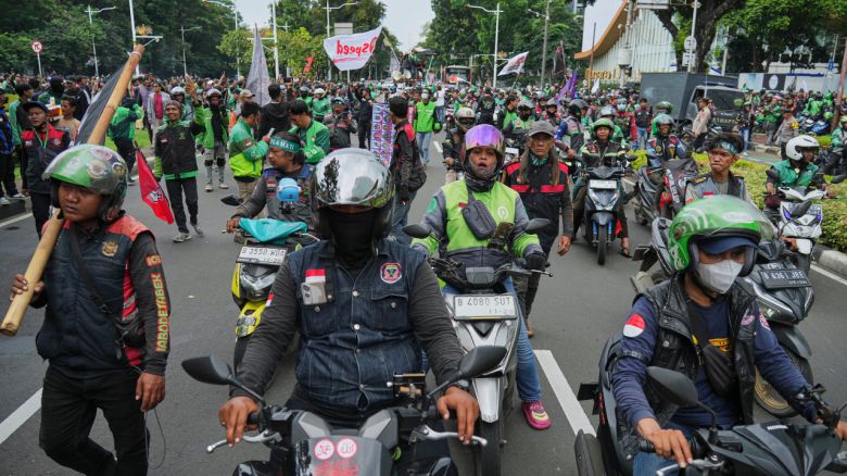 21일 일간 콤파스 등에 따르면 전날 수도 자카르타에서는 인도네시아 최대 테크 기업 고토(GoTo)의 차량 공유 서비스 고젝과 동남아시아 최대 차량 공유 업체 그랩 소속 오토바이 기사 수천 명이 거리로 몰려 나와 오토바이를 타고 깃발을 흔들며 시위에 나섰습니다.