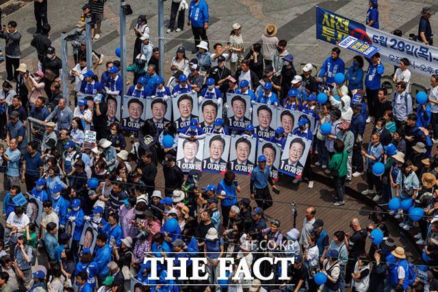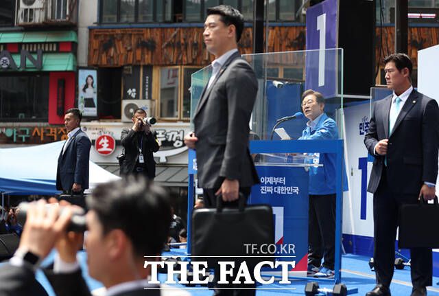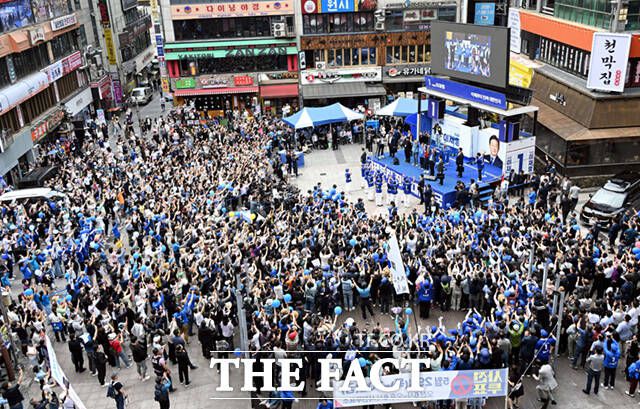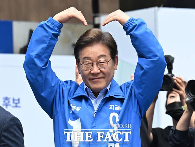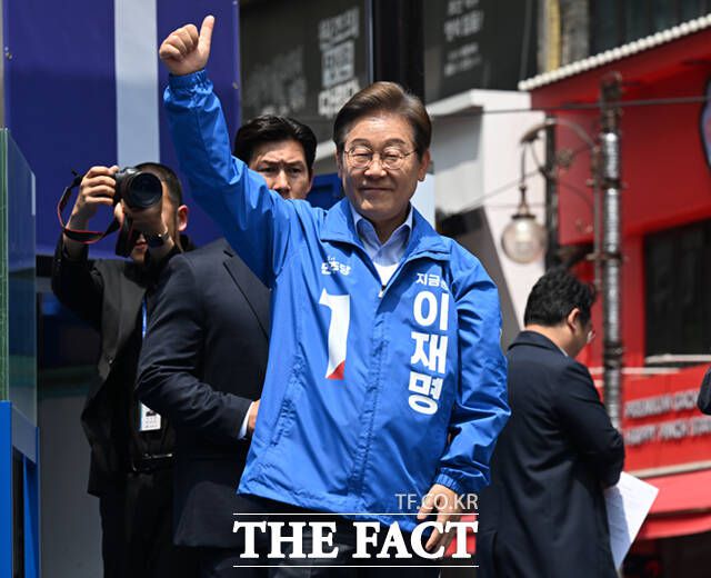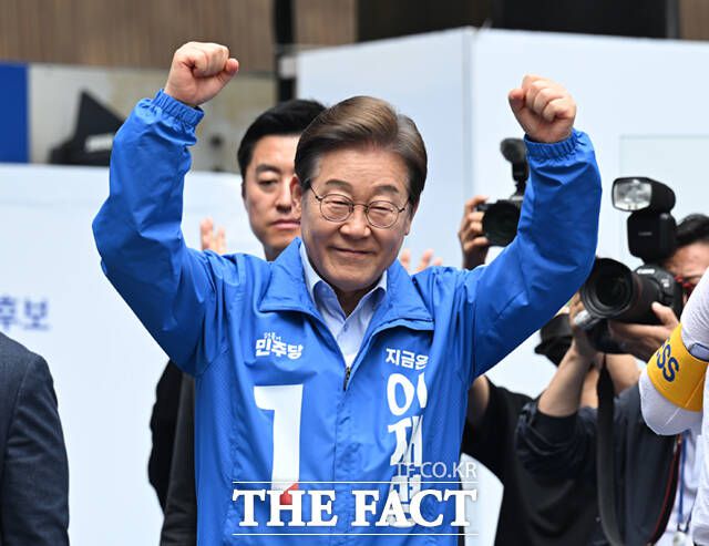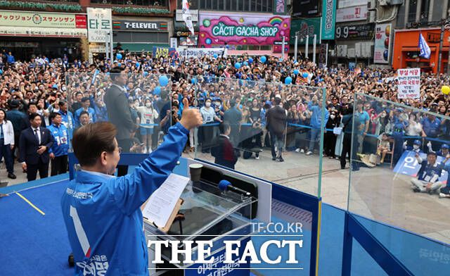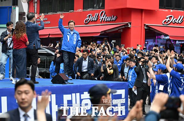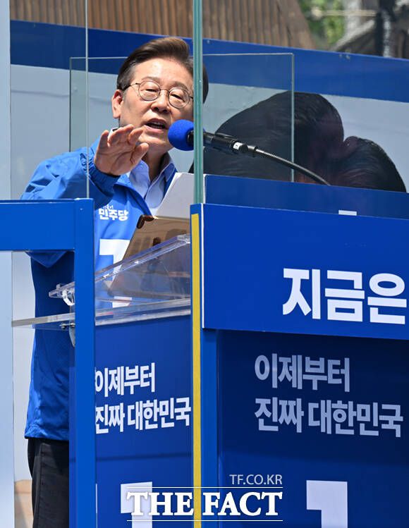 [더팩트ㅣ이새롬 기자] 이재명 더불어민주당 대선 후보가 21일 인천광역시 남동구 구월 로데오광장에서 열린 유세에 참석해 지지를 호소하고 있다.