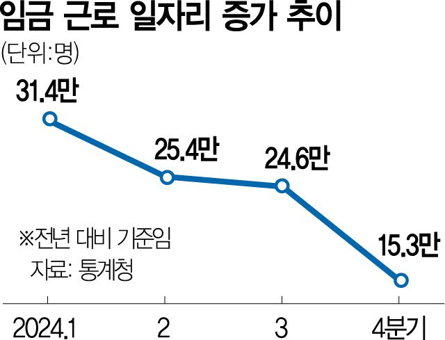 지난해 4분기 임금근로 일자리가 통계 작성 이래 가장 적게 늘어난 것으로 나타났다. 내수 부진 장기화 속에 건설업을 중심으로 일자리가 크게 감소했기 때문이다. 연령대별로 보면 20대 이하 청년층 일자리가 급감해 고용시장에 경고등이 켜졌다.
