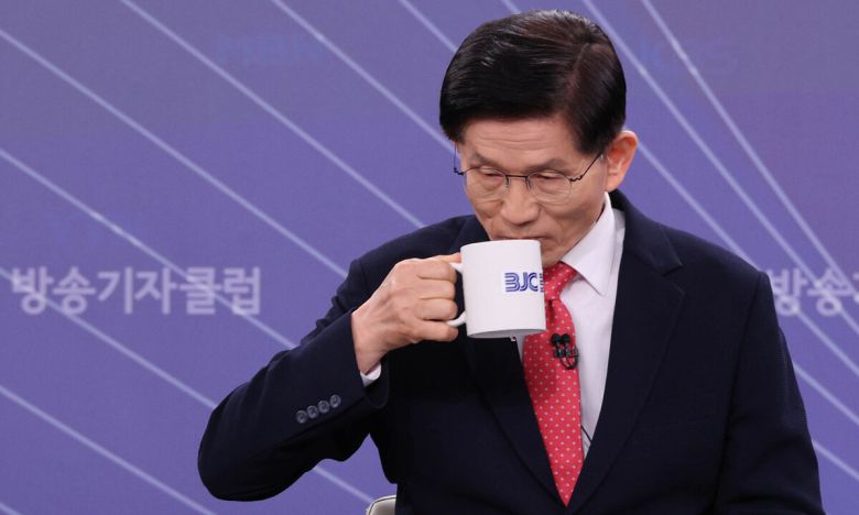 21일 국민의힘 김문수 대선 후보가 경기 고양시 MBN 미디어센터에서 열린 한국방송기자클럽 대선 후보 초청 토론회에서 물을 마시고 있다. 국회사진기자단 |