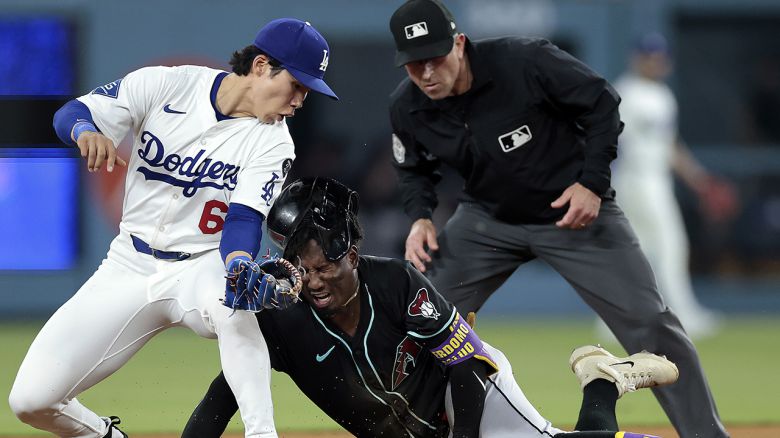 ▲ 애리조나 다이아몬드백스의 헤랄도 페르도모가 20일 캘리포니아주 로스앤젤레스 다저스타디움에서 열린 7회말 로스앤젤레스 다저스의 김혜성을 상대로 2루타를 날리고 있다.