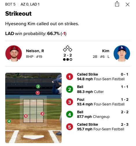 김혜성은 두 번째 타석에서도 출루에 실패했다. 팀이 1-0으로 리드하던 5회말 2사에서 초구 스트라이크, 2구 볼, 3구 파울, 4구 볼 이후 5구 95.7마일(약 154km) 직구에 루킹 삼진을 당했다. 특히 초구는 어깨 높이로 왔는데, 주심은 스트라이크를 선언했다. 김혜성 입장에선 억울할 만했다.