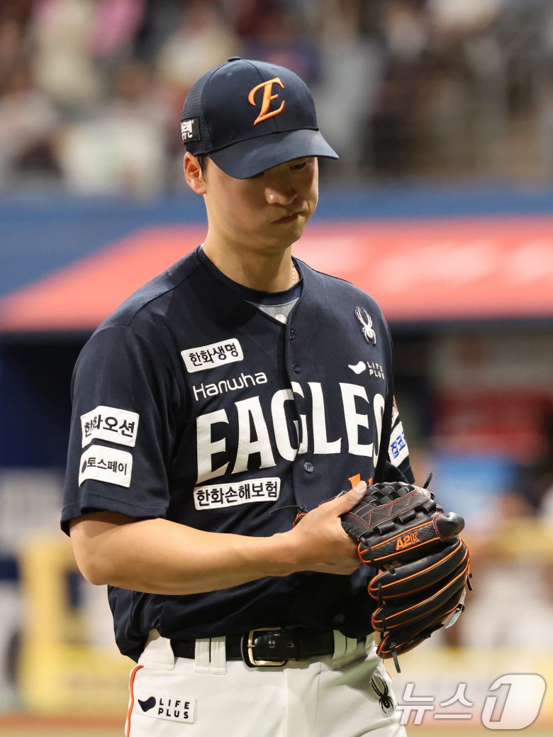 9일 오후 서울 구로구 고척스카이돔에서 열린 프로야구 '2025 신한 SOL뱅크 KBO리그' 한화 이글스와 키움 히어로즈의 경기 4회말 2사 주자없는 상황에서 한화 선발 엄상백이 강판되고 있다. 2025.5.9/뉴스1 ⓒ News1 황기선 기자