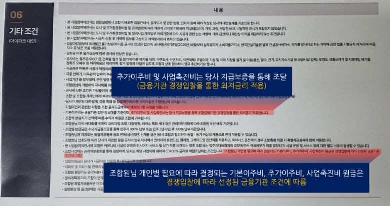 하지만 HDC현산은 ‘사업비 전액 CD+0.1%’를 제안하며 대대적으로 홍보했지만, 실제 공개된 입찰제안서에는 해당 금리는 ‘관리처분총회를 통해 결정한 사업비’에만 적용되는 것으로 제안했다. 게다가 추가 이주비와 사업촉진비 금리는 아예 제시하지 않고 ‘금융기관 경쟁입찰을 통한 최저금리 적용’이라고 불확실하게 게재한 것이다.