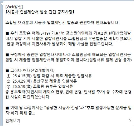 되었다는 내용을 안내하고 있다. [사진=조합원]