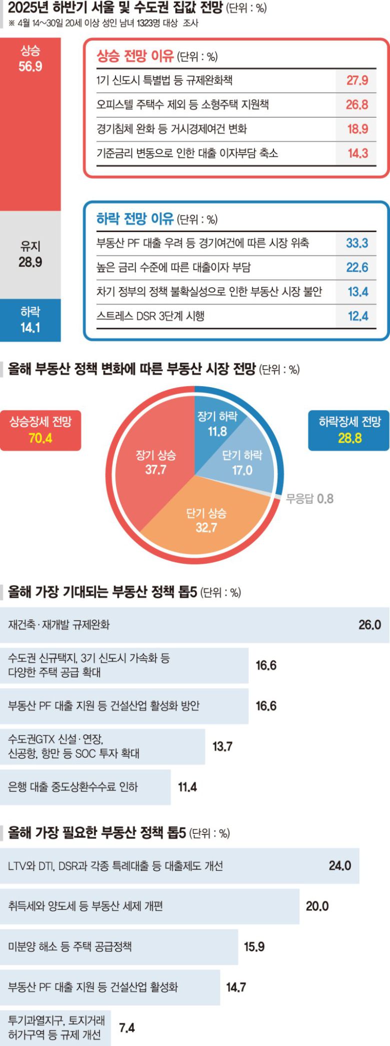앞서 발표한 부동산 정책 중 가장 기대되는 정책으로는 재건축·재개발 규제 완화(26.0%)가 꼽혔다. 이어 수도권 신규 택지, 3기 신도시 가속화 등 다양한 주택 공급 확대(16.6%), 부동산 PF 대출 지원 등 건설산업 활성화 방안(16.6%), 수도권광역급행철도(GTX) 신설·연장, 신공항, 항만 등 사회간접자본(SOC) 투자 확대(13.7%), 은행 대출 중도상환 수수료 인하(11.4%)도 기대했다.