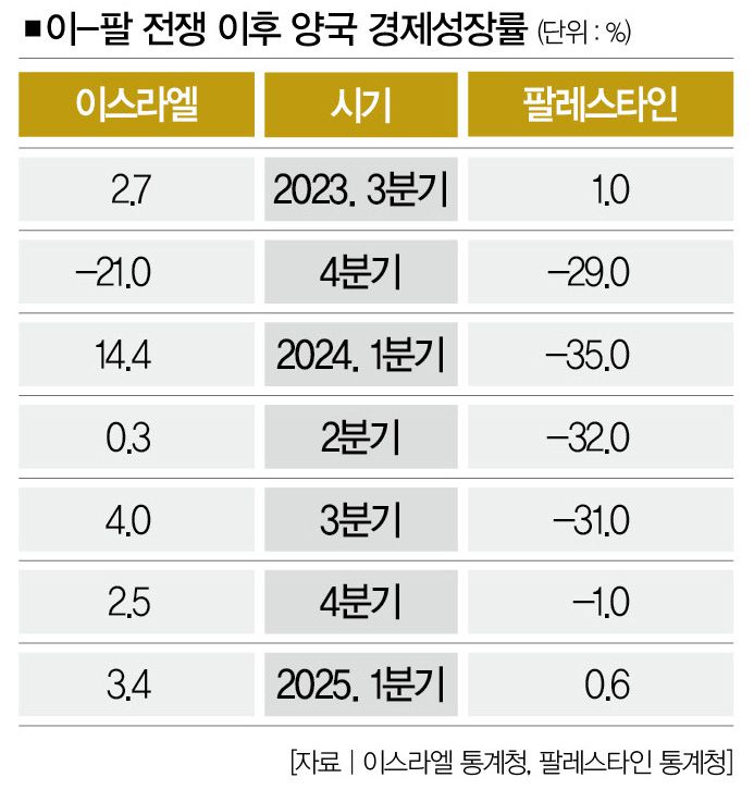 오늘 당장 이스라엘의 대량학살이 멈춘다고 해도 가자지구가 지도상에 이름을 유지하기는 힘들지도 모른다. 유엔무역개발기구(UNCTAD)는 지난해 10월 보고서에서 "가자지구 경제는 사실상 와해했다"며 "전쟁 이전 상태로 회복하려면 약 350년이 걸릴 것"이라고 주장했다. 반면 이스라엘은 자신들이 만들어낸 전쟁의 특수特需를 고스란히 누리고 있다. 이스라엘의 분기별 국내총생산(GDP) 증가율은 2024년 1분기 14.4% 등 5분기 연속 상승했다.