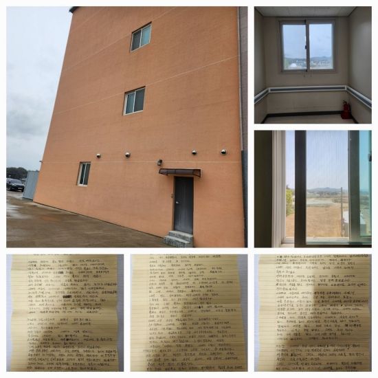 시계 방향으로 문경 한 요양 병원 후면 사고 현장, 복도 창문 현재 휠체어를 이동한 상태, 사고 직후 창문을 열지 못하도록 조치, 아래는 사망한 유족 측이 경찰서에 제출한 진술서.