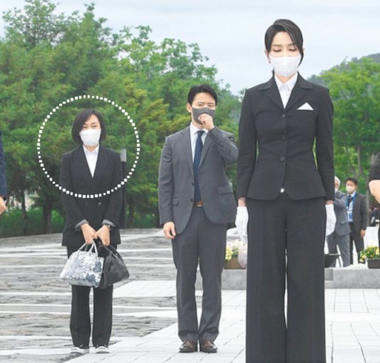 2022년 6월 13일 윤석열 전 대통령의 부인 김건희 여사(오른쪽)가 경남 김해시 봉하마을의 고 노무현 전 대통령 묘역을 참배했을 당시 수행비서 유경옥 씨(왼쪽 점선)가 동행한 모습. 김해=대통령실사진기자단 |