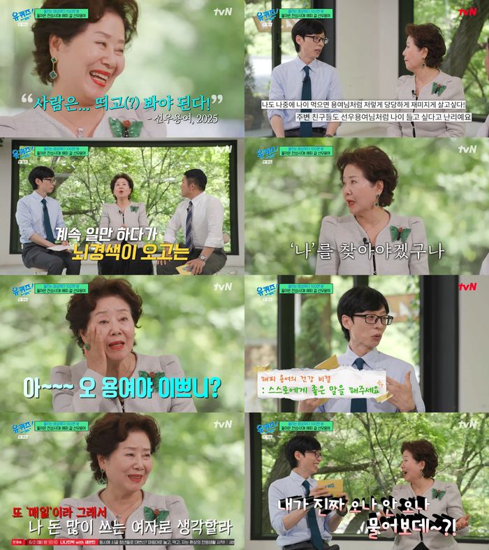 이날 유재석이 “선우용여에게 ‘유퀴즈’ 섭외 요청을 했는데 ‘왜 이제야 불렀냐’고 했다더라”라고 운을 떼자 선우용여는 “정말 기분 나빴다. 다른 사람들 다 초대하면서 왜 나를 이제 불렀냐”고 서운함을 내비쳤다. 이어 “사람이 간사하다. 내가 조금 뜨니까 부른 거 아니냐. 사람은 뜨고 봐야 한다”고 웃었다.