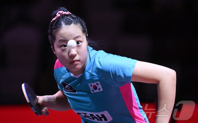 신유빈이 지난 17일 카타르 도하 루사일 스포츠아레나에서 열린 2025 세계탁구선수권대회 개인단식 128강 뉴질랜드 리사 기어(LISA GEAR)와 경기를 펼치고 있다. 2025.5.18/뉴스1 ⓒ News1 사진공동취재단