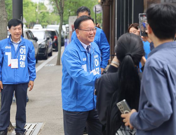 김부겸 더불어민주당 총괄선거대책위원장(왼쪽 둘째)이 21일 전북 전주시 효자동에서 유권자들에게 지지를 호소하고 있다. [사진 더불어민주당] |