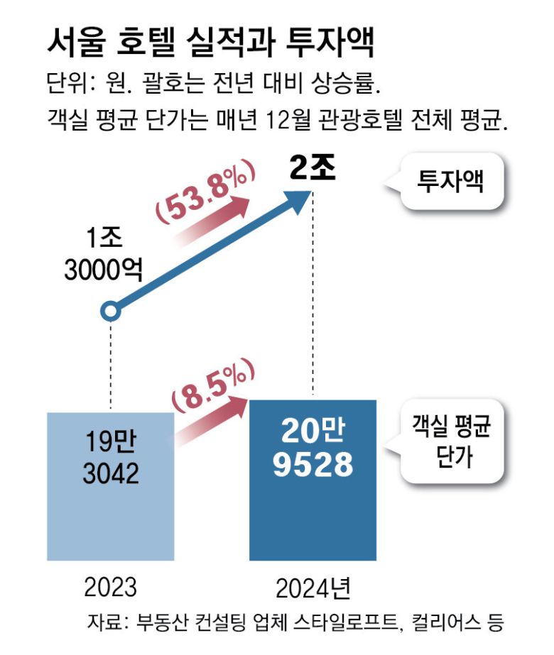 호텔이 안정적인 수익을 낼 수 있는 자산으로 주목받으면서 투자금도 몰리고 있다. 부동산 투자 전문 기업 컬리어스에 따르면 지난해 서울 호텔 시장의 투자 규모는 2조 원으로 2023년(1조3000억 원)의 1.5배로 늘었다.