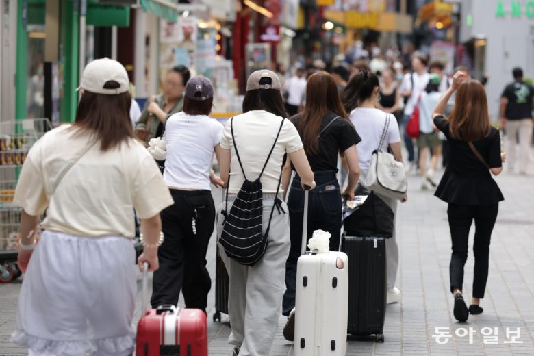 21일 서울 중구 명동 거리에서 외국인 관광객들이 캐리어를 끌고 이동하고 있다. 팬데믹 당시 발길을 끊었던 외국인 관광객들이 다시 한국을 찾으면서 호텔 실적이 개선되고 투자액도 늘고 있다. 박형기 기자 oneshot@donga.com