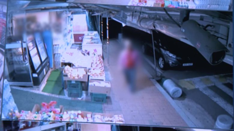 모자와 웃옷이 피에 젖은 남성 한 명이 슈퍼마켓 안으로 들어옵니다.