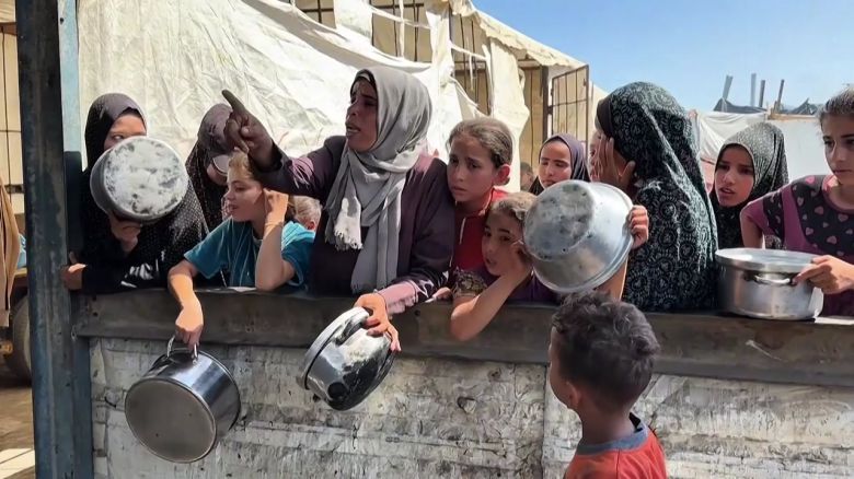 배급이 이미 끝났지만, 팔레스타인 어린이들은 수프 통을 바닥까지 긁어냅니다.