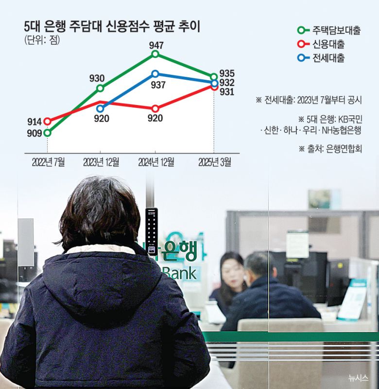 같은 기간 신용대출 평균 신용점수도 914점(2022년 7월)에서 931점(2025년 3월)으로 높아졌다. 전세대출도 2023년 12월 920점에서 올해 3월 932점으로 올랐다. 최근 2~3년 사이 은행 대출을 받기 위해선 신용점수 930~940점이 사실상의 기준선으로 자리 잡은 셈이다. KCB 신용점수 기준에 따르면 942점 이상은 1등급, 891~941점은 2등급, 832~890점은 3등급으로 분류된다. 일반적으로 900점 이상은 고신용자, 950점 이상은 초고신용자로 분류된다.