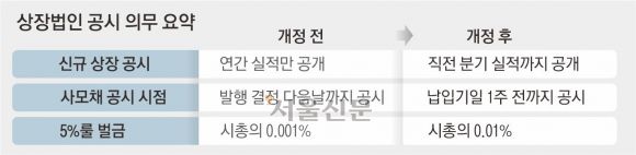 또 사모 전환사채(CB)와 신주인수권부사채(BW) 등의 발행공시 의무가 납입기일 당일→일주일 전으로 강화된다. 그동안은 납입기일 직전 발행 사실이 공시되는 경우가 많아 발행에 문제가 있어도 주주들이 발행중단을 청구하기엔 물리적인 시간이 부족했다. 대량보유 보고 의무(5%룰) 위반에 따른 과징금 한도가 10배 높아진다. 투자자들에게 ‘큰손’들의 지분 보유 현황을 알려주는 중요 공시지만, 위반 시 과징금 한도가 낮다는 문제를 개선하기 위한 것이다.