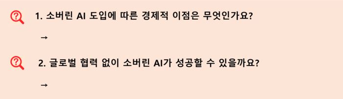△단점: 초기 개발 비용과 시간이 많이 들어가고, 글로벌 협력 부족 시 기술 발전 속도가 떨어질 가능성이 있으며, 자국 내 기술 수준이 글로벌 수준에 미치지 못할 경우 경쟁력이 뒤처질 수 있어요. 또 만약 소버린 AI가 특정 가치나 정보만을 강조하게 된다면, 사람들이 다양한 관점을 잃고 비판적인 생각을 하기 어려워질 수도 있습니다. 다양한 AI 모델이 공존하는 것이 중요한 이유입니다.