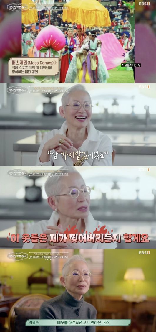 밀라논나는 “지금과 시대가 다를 때니까 참 가시밭길이었다. 조직위원회가 있었는데 제가 위촉을 받아서 디자인을 해드리니까 예산을 잡았는데 디자인이 예산에 포함되지 않았다. 난 디자이너로 대접을 받아야겠다고 생각했다. 디자인 비용을 따로 달라고 했는데 처음에 곤란하더고 하더라. 그래서 ‘이 옷들은 찢어버리겠다’고 하니까 조직위원회의 답변이 국가 예비비에서 디자인료를 받은 분은 처음이니까 자랑하라고 하더라”라며 40년 만에 처음 자랑한다고 설명했다.