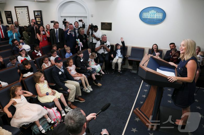 캐롤라인 레빗 미국 백악관 대변인이 20일(현지시간) '자녀를 직장에 데려오는 날'을 맞아 아이들의 질문을 받고 있다. 2025.05.20 ⓒ 로이터=뉴스1 ⓒ News1 정지윤 기자 |