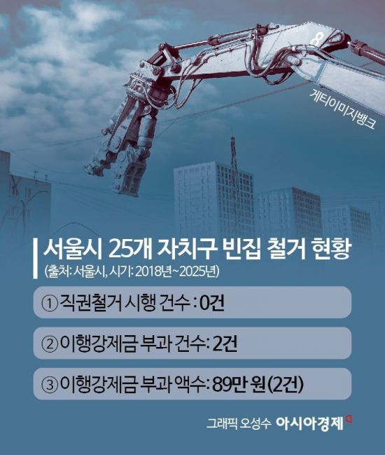 그러나 시에서 직권 철거한 사례는 없다. 예를 들어 서울시는 용산구 내 3개 구역을 빈집밀집구역으로 지정했지만 별도의 관리 조치는 하지 못했다. 아시아경제 취재 결과 서울시 25개 자치구 가운데 2018년 이후로 7년간 빈집을 직권 철거한 자치구는 단 한 곳도 없었다. 이행강제금의 경우 성동구가 지난해 부과한 2건(총액 89만원)이 전부였다.