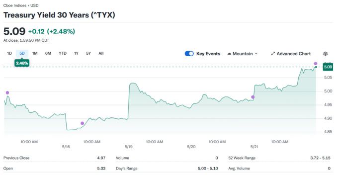 미 국채 30년물 수익률 차트, 자료=야후 파이낸스, 2025.05.22 koinwon@newspim.com