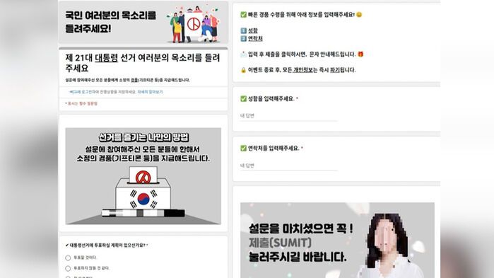 수신자가 링크를 클릭하면 '제21대 대통령 선거 설문조사'라는 가짜 페이지로 연결돼 투표 계획과 후보 기준 등을 묻는 항목이 등장합니다.