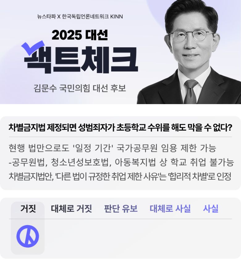 결국 김문수 후보의 사례는 성폭력 범죄자가 학교에 취업할 수 있다는 식으로 사례를 극단화하고, 성소수자가 이성애자들의 취업을 위협한다는 공포심을 조장해 차별금지법을 공격한 사례에 해당한다. 이는 차별금지법의 입법 취지와 예외 규정, 현행 법령과 모두 배치되는 과장된 허위 정보다.