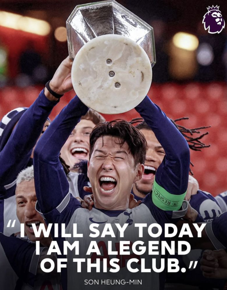 손흥민은 “17년 동안 아무도 해내지 못했다. 늘 꿈꿔왔던 순간이다. 오늘이 바로 그 날이에요. 세상에서 가장 행복한 사람이다. 시즌 전체를 돌아보면 항상 힘든 상황이 있었는데 선수들은 항상 뭉쳐서 싸웠다. 압박감이 있었지만 정말 간절했다. 일주일 동안 이 경기를 꿈꿨고 이제 편하게 잠들 수 있다. 평생 잊지 못한 날로 만들고 싶다”라고 말했다.