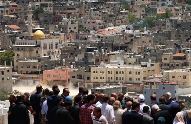 19일 팔레스타인 서안지구 툴카렘의 누르샴 난민캠프를 찾은 유럽연합(EU) 참관단이 난민캠프를 시찰하고 있다. 툴카렘=EPA 연합뉴스 |