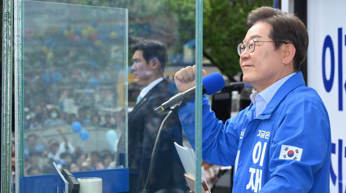 [인천=뉴스핌] 김학선 기자 = 이재명 더불어민주당 대선 후보가 21일 인천 부평구 부평역 북광장에서 시민들에게 지지를 호소하고 있다. 2025.05.21 yooksa@newspim.com