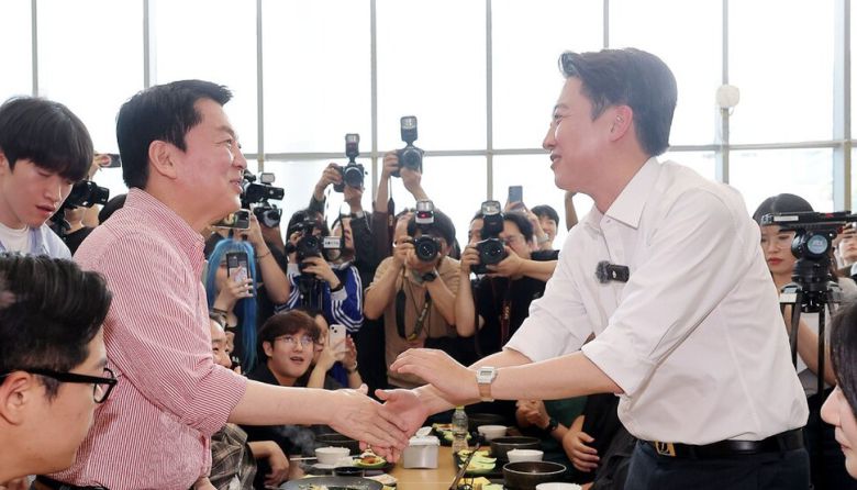이준석 개혁신당 대통령 후보가 21일 ‘학식먹자 이준석’ 행사가 열린 경기 성남시 가천대학교 글로벌캠퍼스에서 행사에 참여한 안철수 국민의힘 의원과 만나 악수를 나누고 있다. 연합뉴스 |