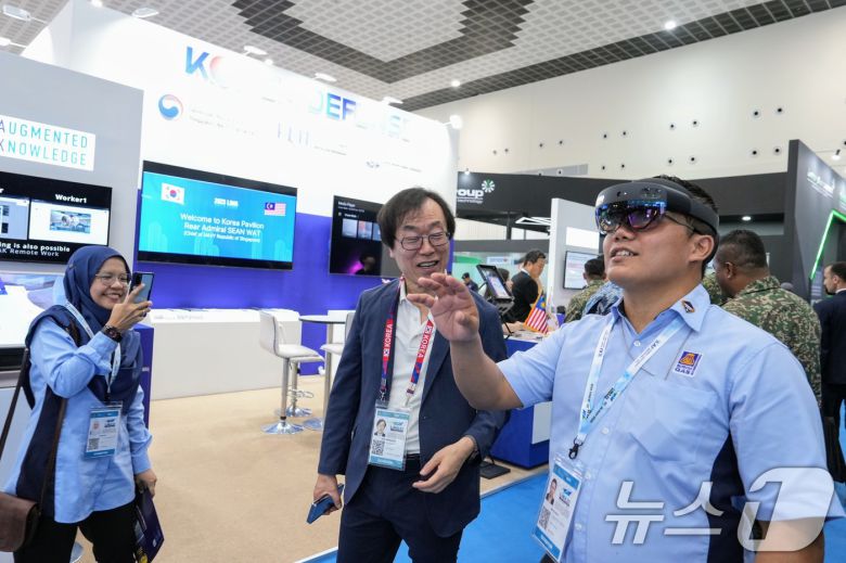 지난 21일(현지시간) 말레이시아 방산전시회 'LIMA 2025'에 마련된 한국관에서 조근식 증강지능 대표(가운데)가 인공지능(AI) 기반 혼합현실(MR)을 이용한 항공 정비 시뮬레이터 체험을 안내하고 있다. (한국방위산업진흥회 제공. 재판매 및 DB 금지) 2025.5.22/뉴스1 |